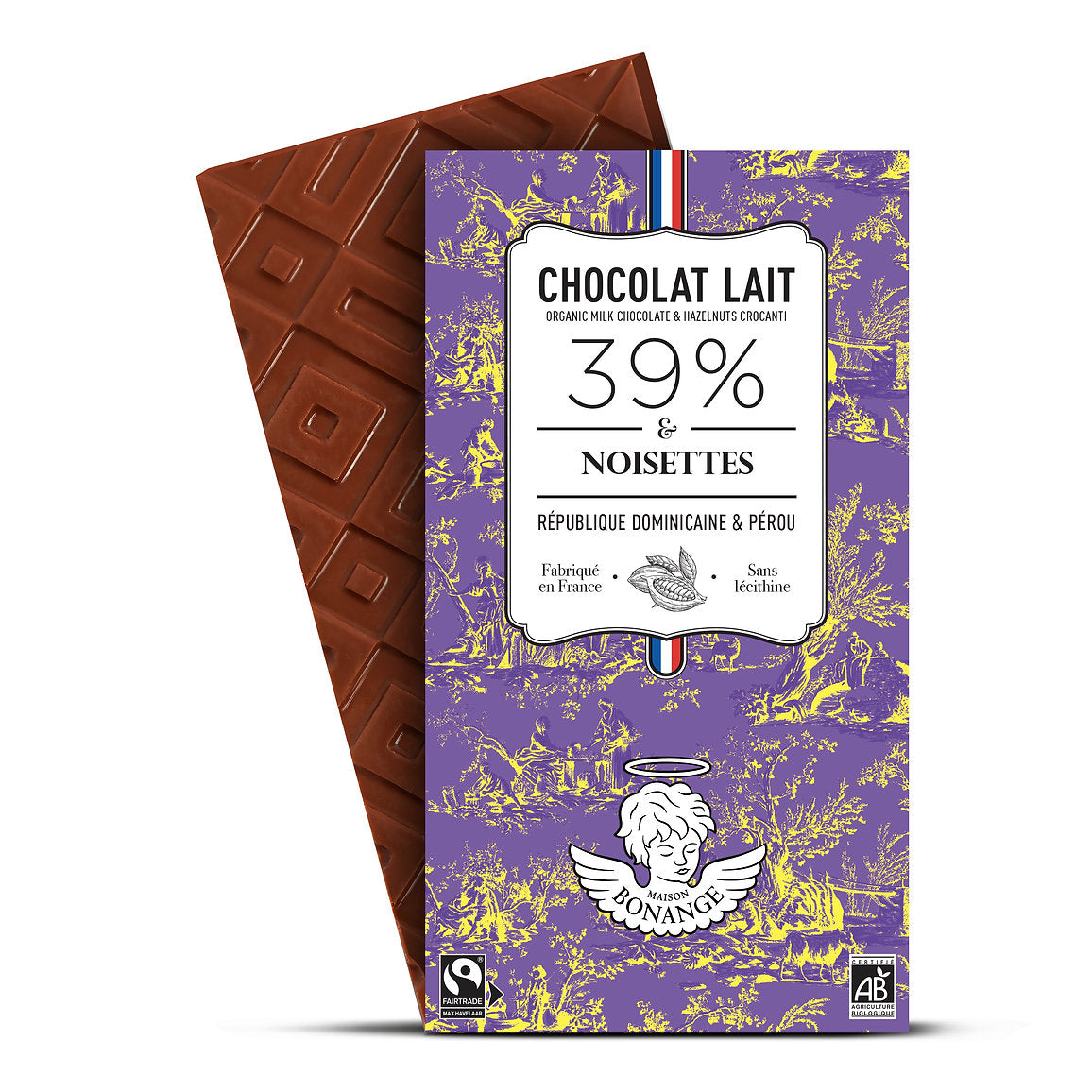 Sucre de canne**, beurre de cacao**, lait en poudre*, masse de cacao**, extrait de vanille**, noisettes toastées*. *issu de l’agriculture biologique - **commerce équitable.Cane sugar**, cocoa butter**, milk powder*, cocoa mass**, vanilla extract**, roasted hazelnuts pieces*. *issued from organic farm - ** issued from oraganic and fairtrade farming.