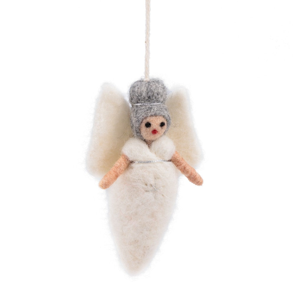 Een vilten engeltje in wit met zilveren accenten, een sierlijke toevoeging aan je kerstdecoratie. Dit engeltje staat symbool voor licht en bescherming. Hang het op een mooie plek in huis.