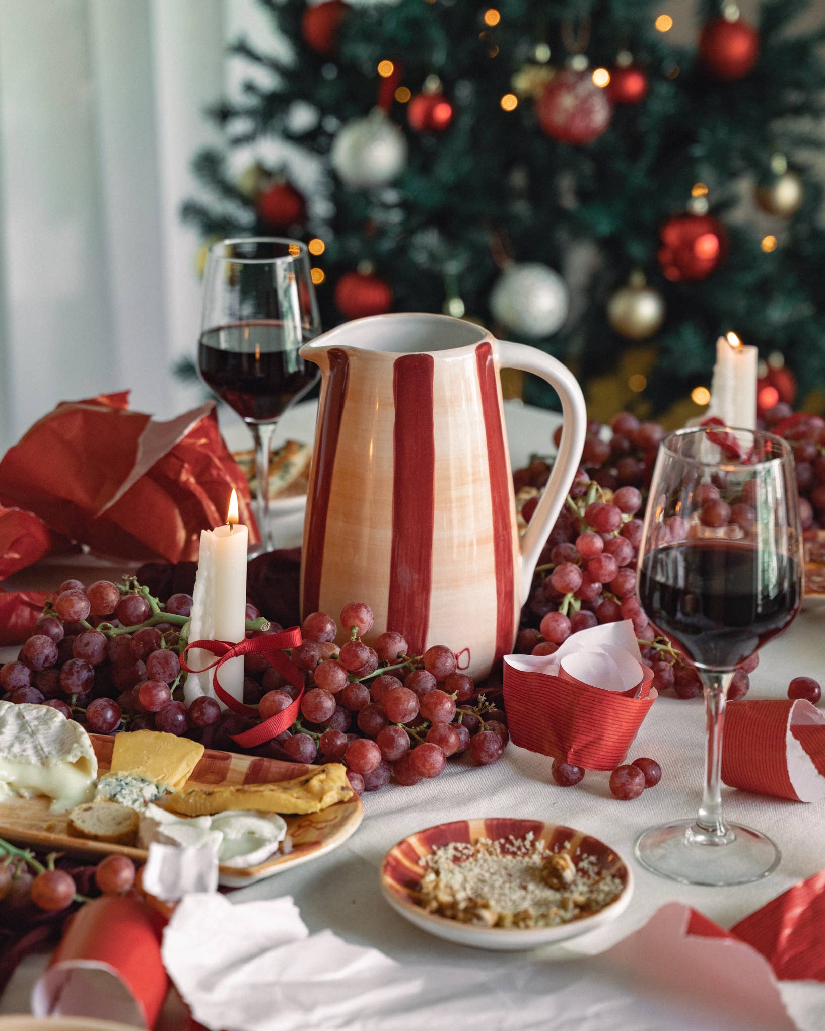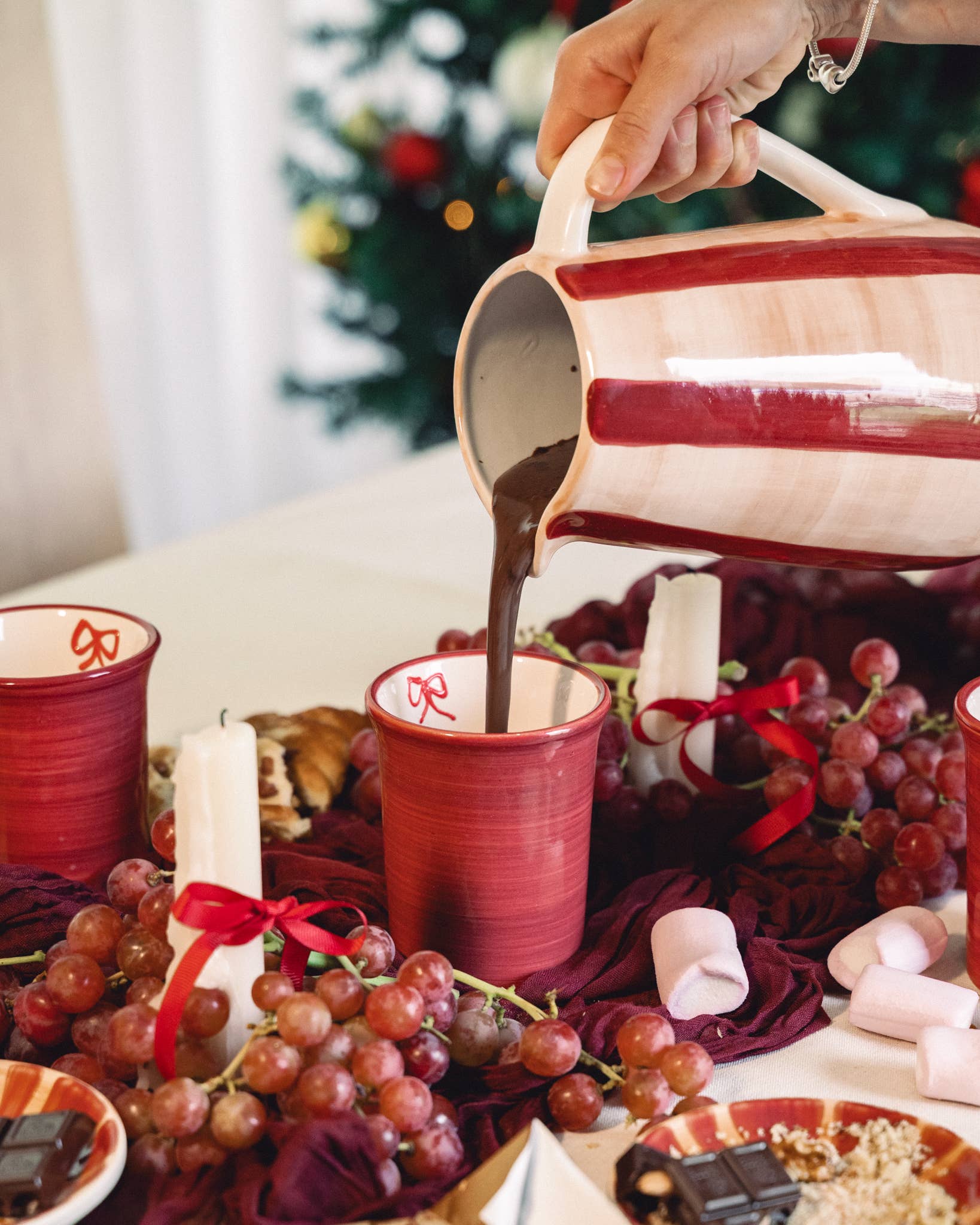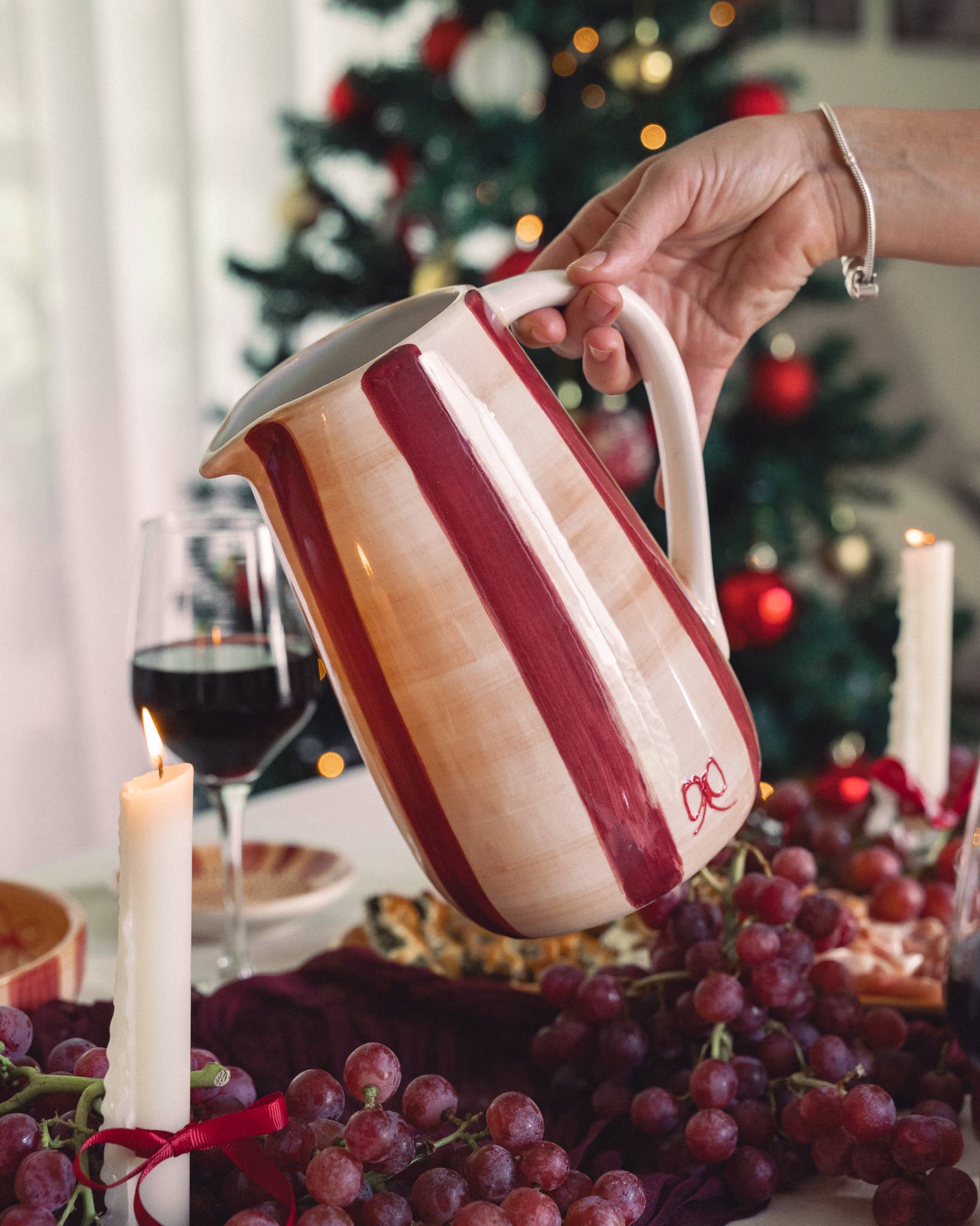 Celebrate the season with this elegant handmade ceramic pitcher from our Noelle collection, crafted by artisans in Southern Spain. With a rich burgundy exterior, soft beige interior, and a delicate red bow detail, this festive jug captures the charm of traditional Spanish pottery while bringing a warm touch to your Christmas decor and fall decor.
