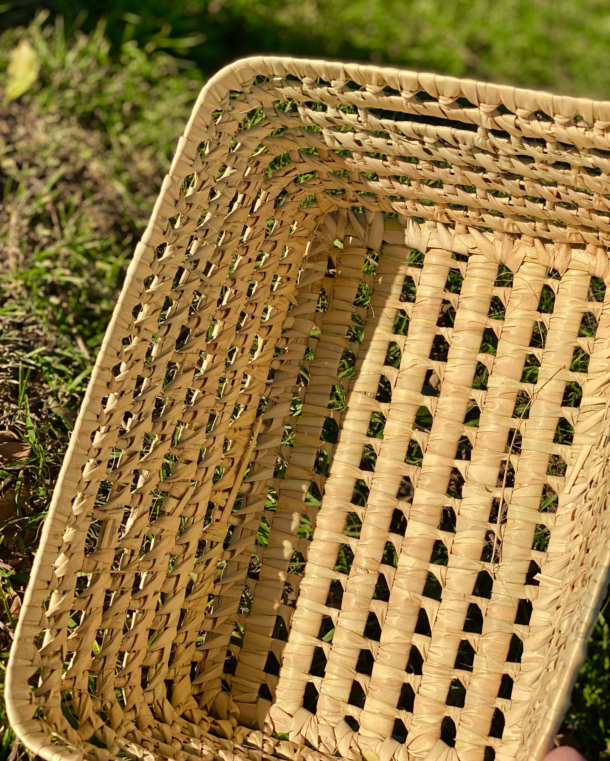 Handmade, natural color. It has multiple uses as a storage box. Very durable and easy to clean.