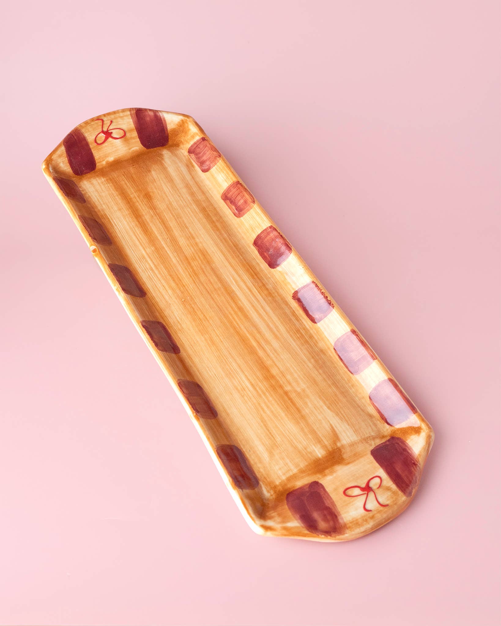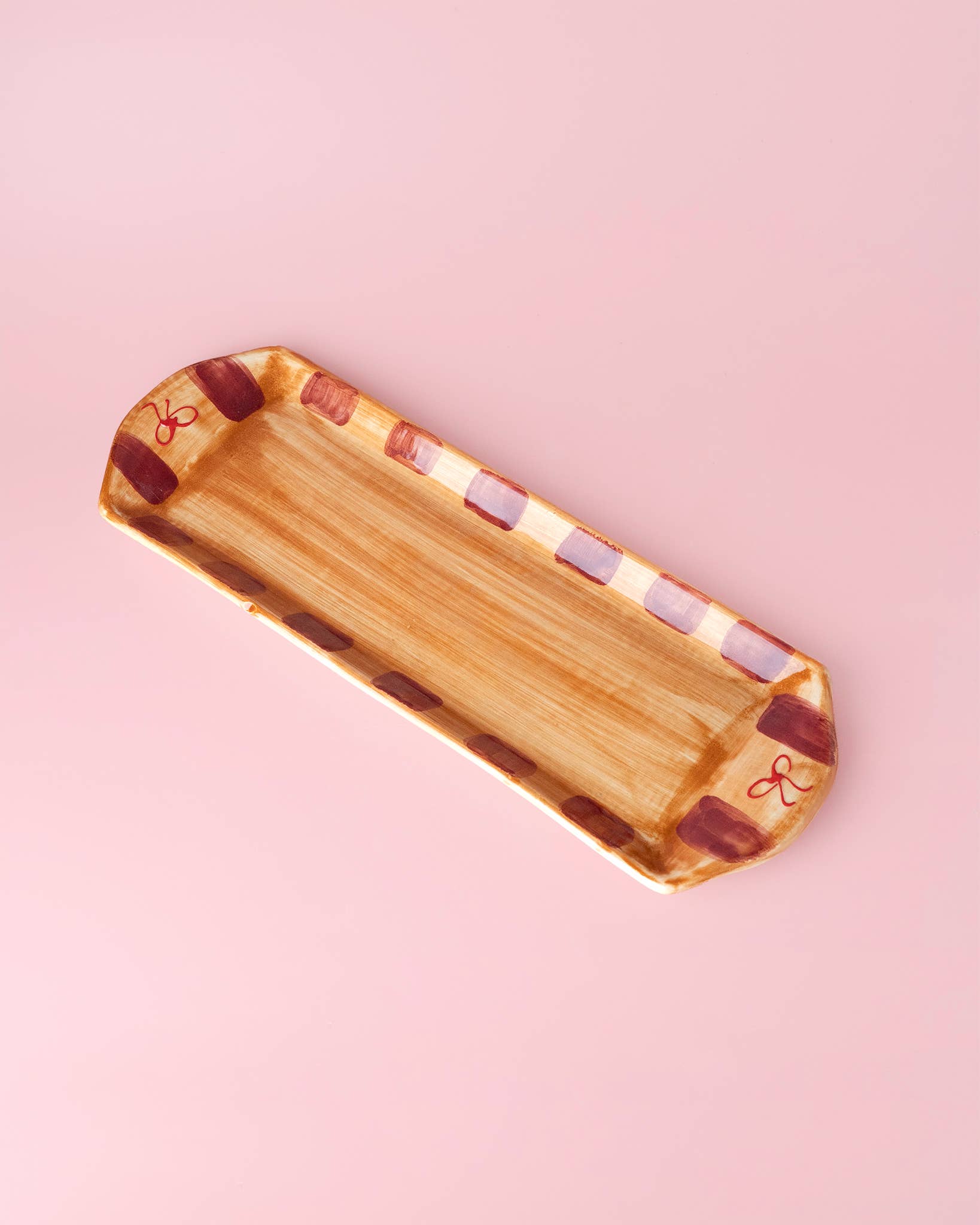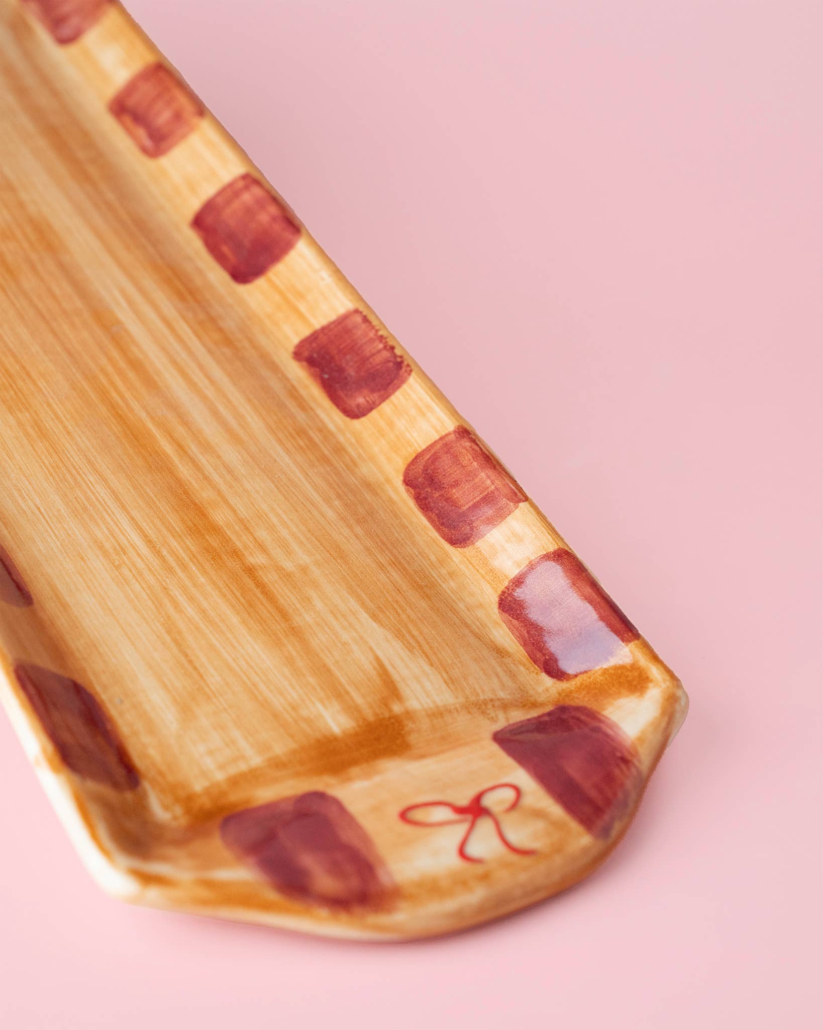 Bring the warmth of Southern Spain to your holiday table with this handmade ceramic Christmas tray from our Noelle collection. Crafted by skilled artisans using traditional pottery techniques, this platter combines rustic elegance with festive charm. Its deep burgundy tones, soft beige accents, and delicate red bow details celebrate the spirit of the season, making it a timeless piece for fall decor, Halloween gatherings, and Christmas decor.